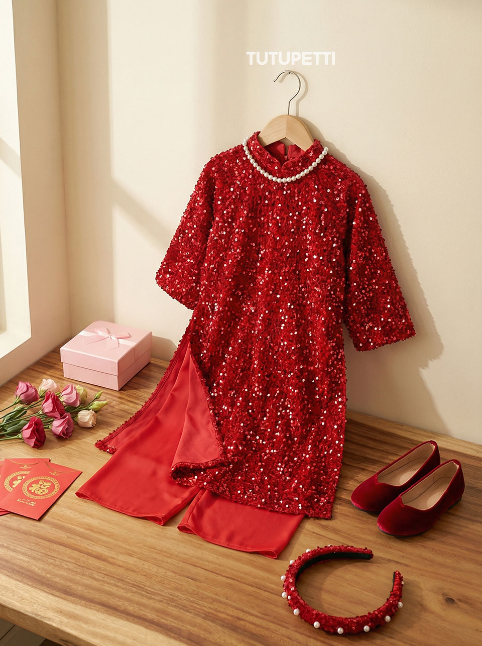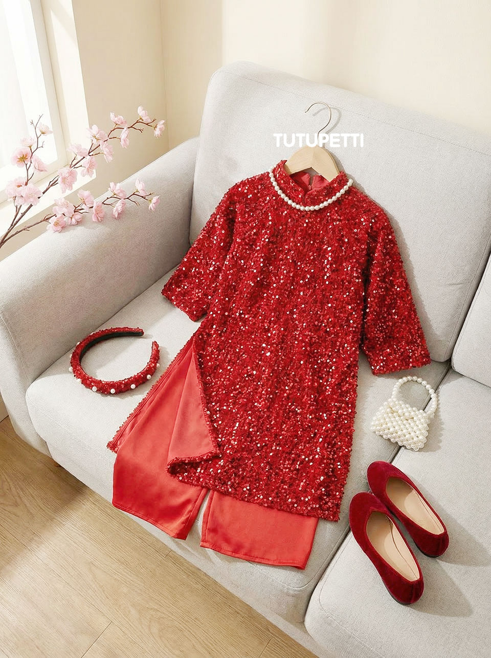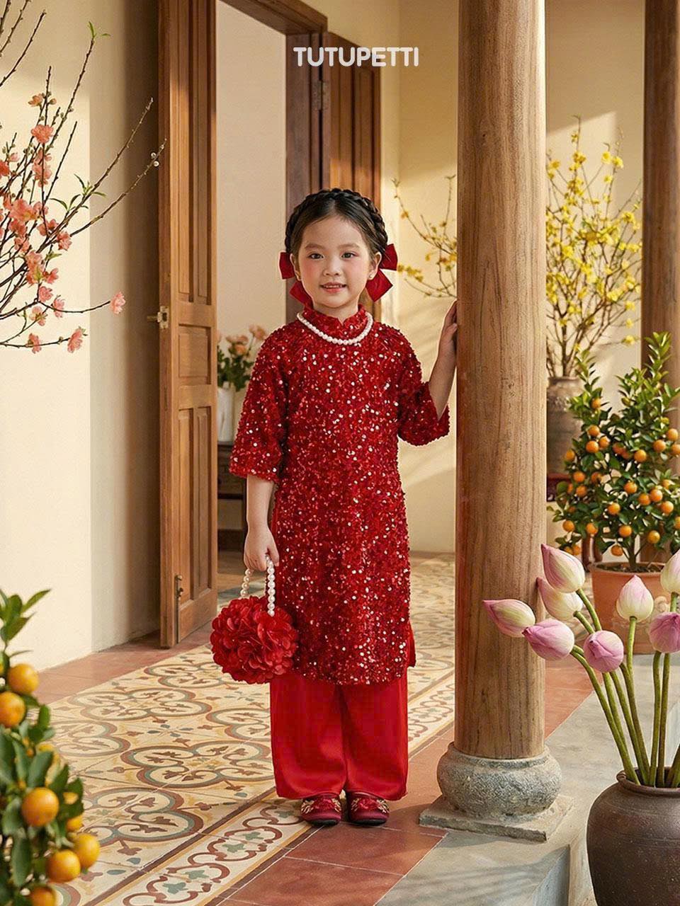 Thông tin chi tiết Áo Dài Kim Sa Nhung Đỏ Cho Bé